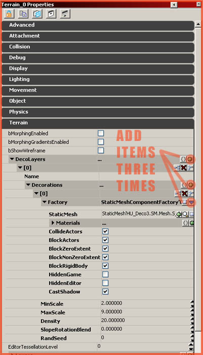 Deco Layers are set up in a similar fashion. Open up the properties of the terrain itself, simply doubleclicking its surface anywhere in the level should do, and navigate to Terrain – Decolayers. Add an item to it, and then add yet another item to Decorations. Then, add a StaticMeshComponentFactory to it, and correctly set the StaticMesh and other relevant properties.