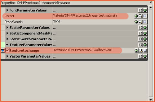 Create a new material , and add a TextureSampleParameter2D (=Parm2D) expression instead of a regular TextureSample. Fill in your texture into Parm2D expression, as if it were a regular TextureSample, and also be sure to set a ParameterName . The name will be used to identify all the expression in Kismet and the Material Instance later, so pick something descriptive.