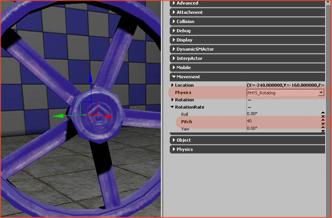 You could use Matinee to make a rotating animation, but it is usually easier to go with the oldschool approach, and simply do it all via the properties of the InterpActor. Open up those properties and navigate to the section Movement . Set Physics to PHYS_Rotating , and set a value to RotationRate .