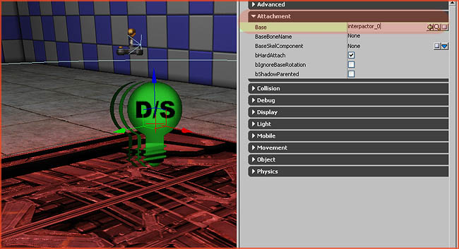 Next, open up the properties of whatever actor you want to attach, and navigate to Attachment . Enter the name of the actor you want to attach to in Base . In my case my InterpActor is called InterpActor_0, so I typed that in Base and I hit enter. That is it.