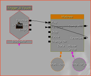Connect Touched to Play , and connect the Matinee's Completed to its own Reverse . This will make the platform return automatically as soon as it reaches the end of its animation. Also note how I set MaxTriggerCount to 0 in the properties of the Trigger_0 Touch event.