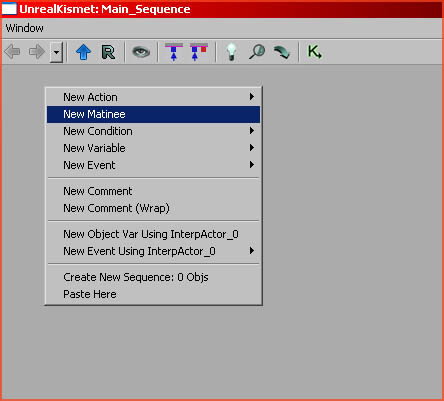Keep the InterpActor you just made selected in the viewport , and then in the Kismet window rightclick the large empty grey space in the middle and add a New Matinee .