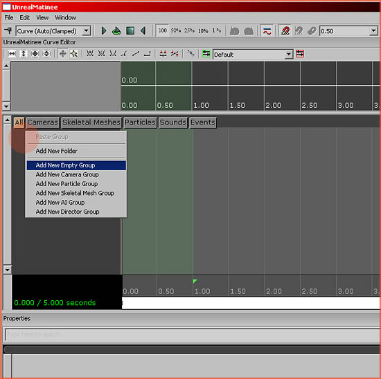 A Matinee block is added. Doubleclick this block to open the Matinee sub editor, and then rightclick in the dark grey space in the center left of this window. Add New Empty Group .