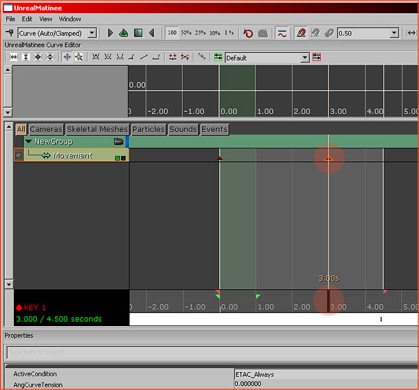Move the timeline to another position, in my example it was moved to 3 seconds, by clicking in the dark grey space at the bottom of the timeline. Press "Enter" to add a Key to the current position. Keys are positions the engine remembers. Note how you can increase or decrease the length of the matinee by clicking and dragging the small orange triangle at the bottom right. In my example it is located at 4.5 Seconds.