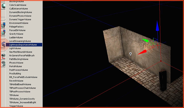 You may have noticed that the lighting rebuild you just did popped up an error about a missing lightmass importance volume. A LM importance volume is a special volume that determines how high the quality should be in a specific area. So everything inside one of those volumes will receive full quality lighting, the parts outside these volumes however will be lower in quality. The practical use of this is for example a level surrounded by a city. In such case only the playable section of the level should be covered with the volume because it would be pointless to calculate high quality lighting for that surrounding and distant city.
