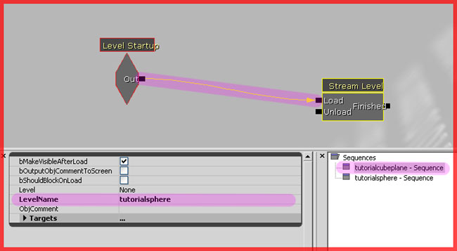 Then, connect the Level Startup event to the Load input of the Stream Level node and click on it. In its properties type the name of the file to load in the " LevelName " input field.